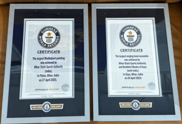बिहार ने बौद्ध भिक्षुओं और गायन बाउल कलाकारों की टुकड़ी के प्रदर्शन के माध्यम से दो गिनीज वर्ल्ड रिकॉर्ड बनाने में एक अद्वितीय उपलब्धि हासिल की है। गिनीज वर्ल्ड रिकॉर्ड के अधिकारियों ने आज पटना के पाटलिपुत्र स्पोर्ट्स कॉम्प्लेक्स में मुख्यमंत्री नीतीश कुमार को प्रमाण पत्र सौंपे।