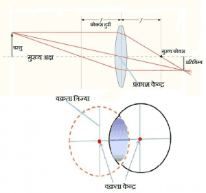 वक्रता केन्द्र – लेंसों का केन्द्र वक्रता केन्द्र कहलाता है। तथा इनकी त्रिज्या वक्रता त्रिज्या।